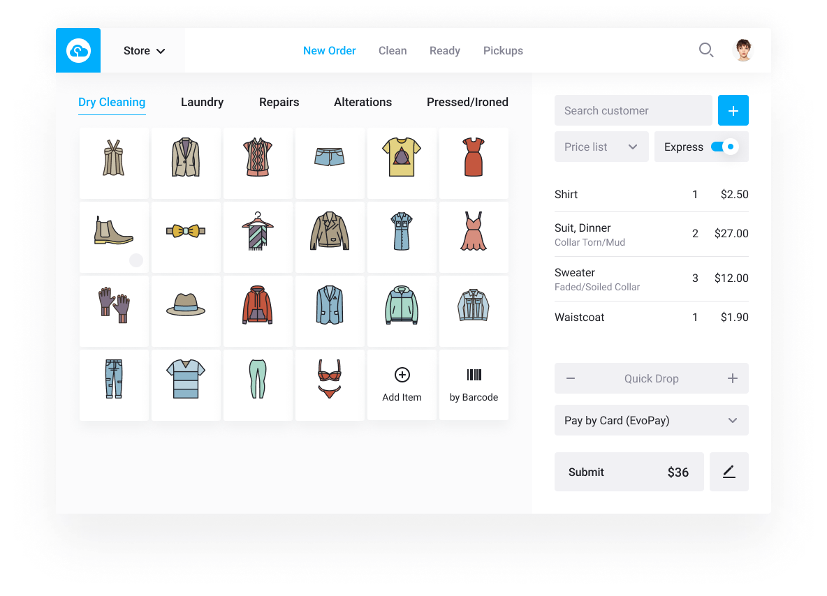 Vollständige Eigenschaften, stark und einfach in der Verkaufsstelle zu benutzen für Ihre trockene Reinigung, Wäsche oder Allertationen Unternehmen. CleanCloud wird Sie in Minuten zum rennen bringen.